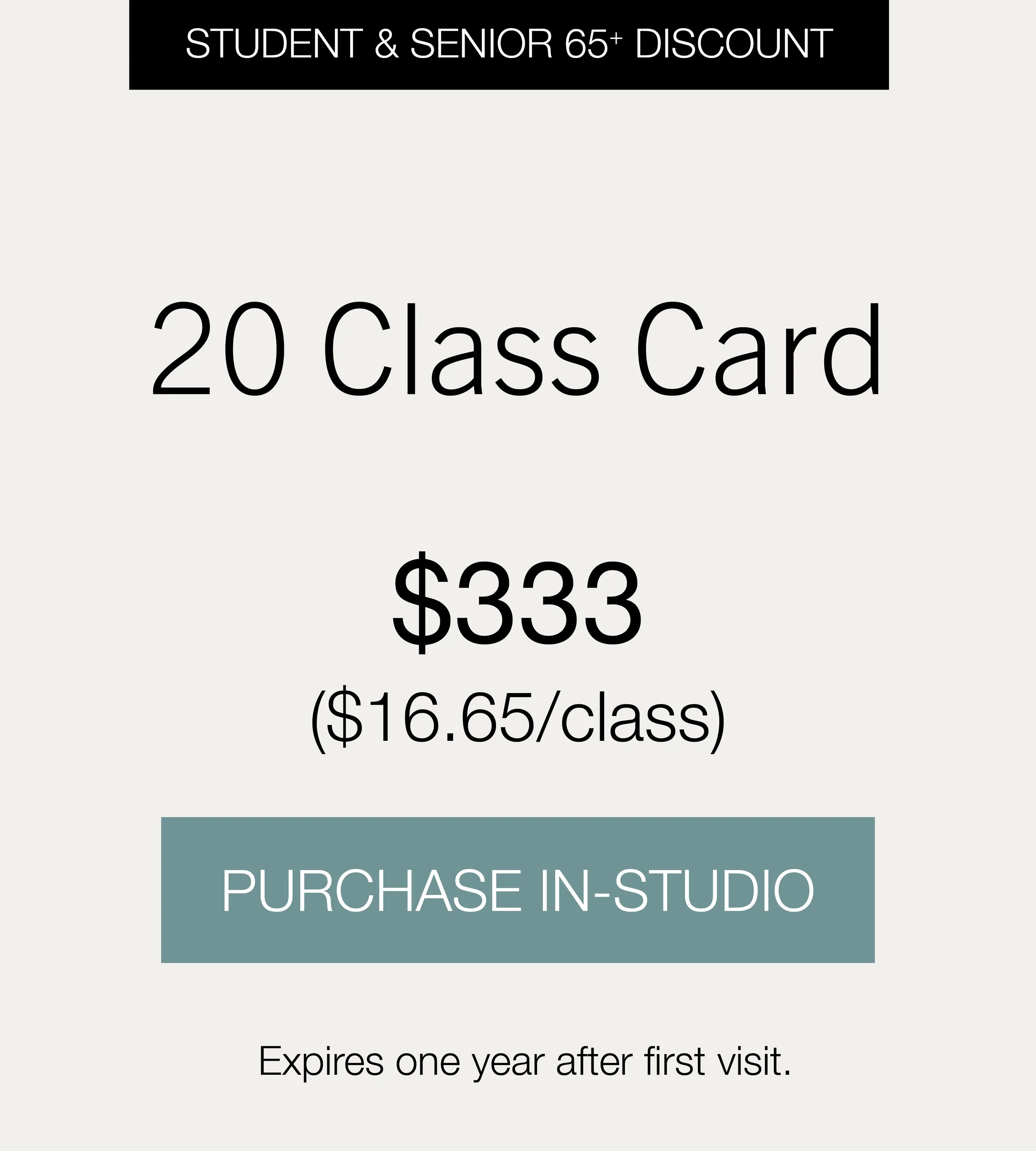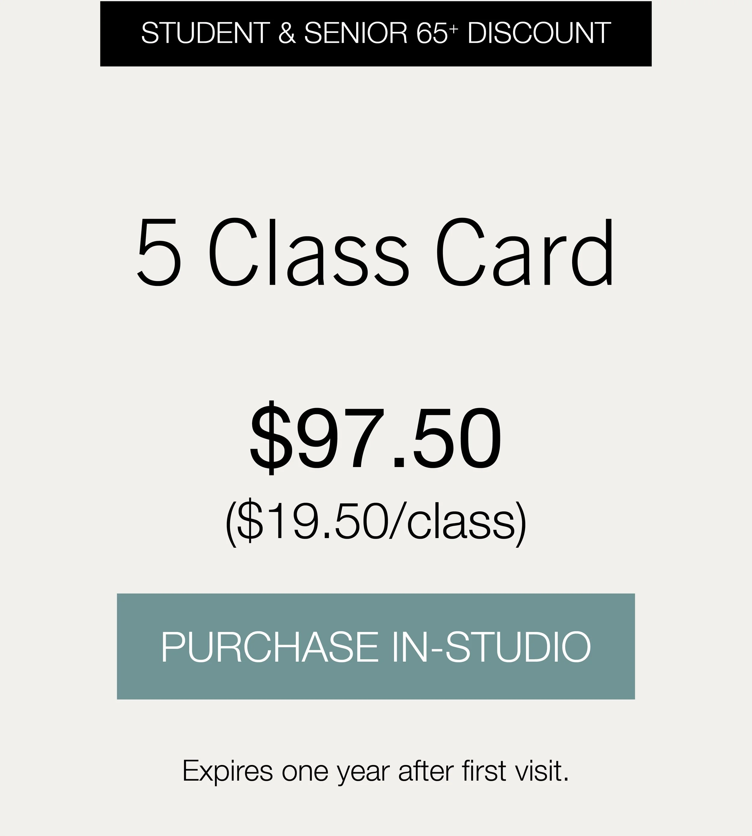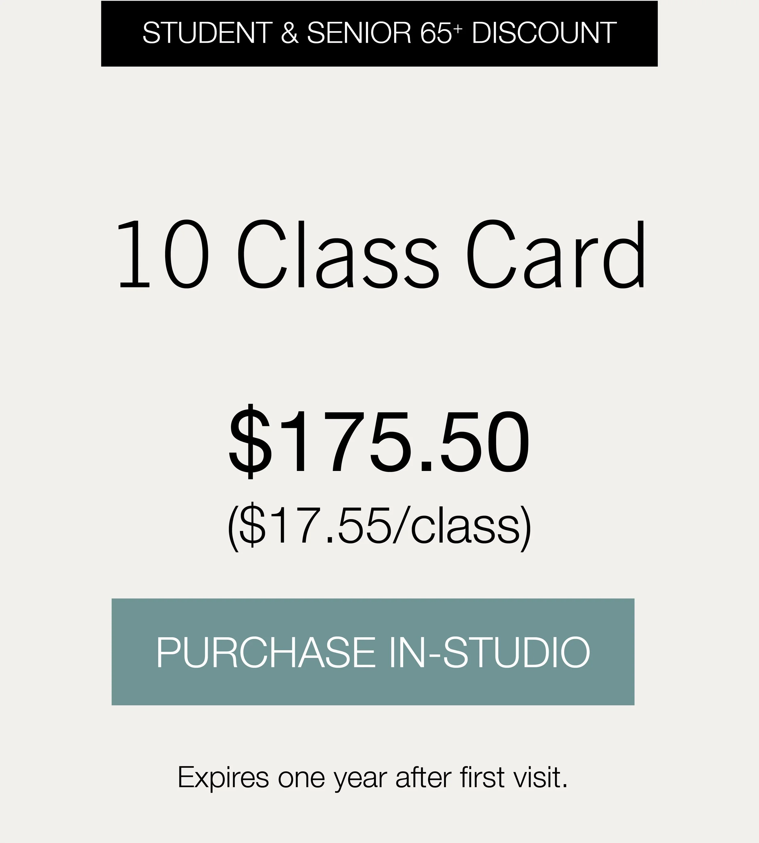 First Week $44 NEW CLIENT OFFER Redeem New Client Offer PRICINGStudio Rental and Discount PassesMat and towel rentals are available at the studio for $2 each. Student and senior discounted passes can be purchased in person at the studio with a valid photo ID.